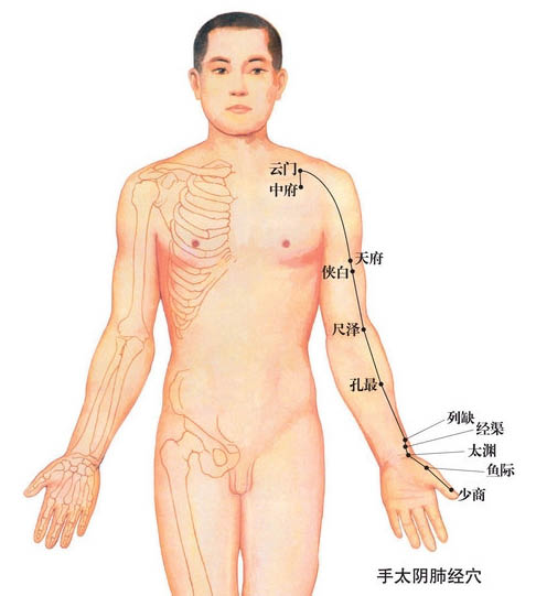 手太阴肺经起于中焦,向下络大肠,上行经胃口,过膈,属肺。从肺系(气管及喉咙)横走浅出侧胸上部(中府),沿上肢内侧前缘、手少阴心经和手厥阴心包经之前,经过肘关节、腕后寸口部,沿手掌大鱼际缘,止于拇指桡侧端(少商)。分支从腕后分出,止于食指桡侧端,下接手阳明大肠经。