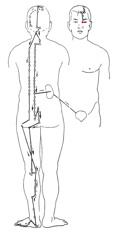 足太阳膀胱经起于目内眦(睛明),上额,交于巅顶(百会)。巅顶部支脉,从头顶到颞颥部。巅顶部直行的脉,从头顶入络脑,向下至项部,沿着肩胛内侧,夹脊柱,抵达腰部,进入体内,络肾,属膀胱。腰部的支脉,向下经过臀部,进入腘窝中。后项部的支脉,通过肩胛骨内侧缘下行,经臀部,沿着大腿外侧后缘,与腰部支脉在腘窝相合,从此向下,通过腓肠肌,经外踝后,沿着第5跖骨粗隆,至小趾外侧端(至阴),交足少阴肾经。