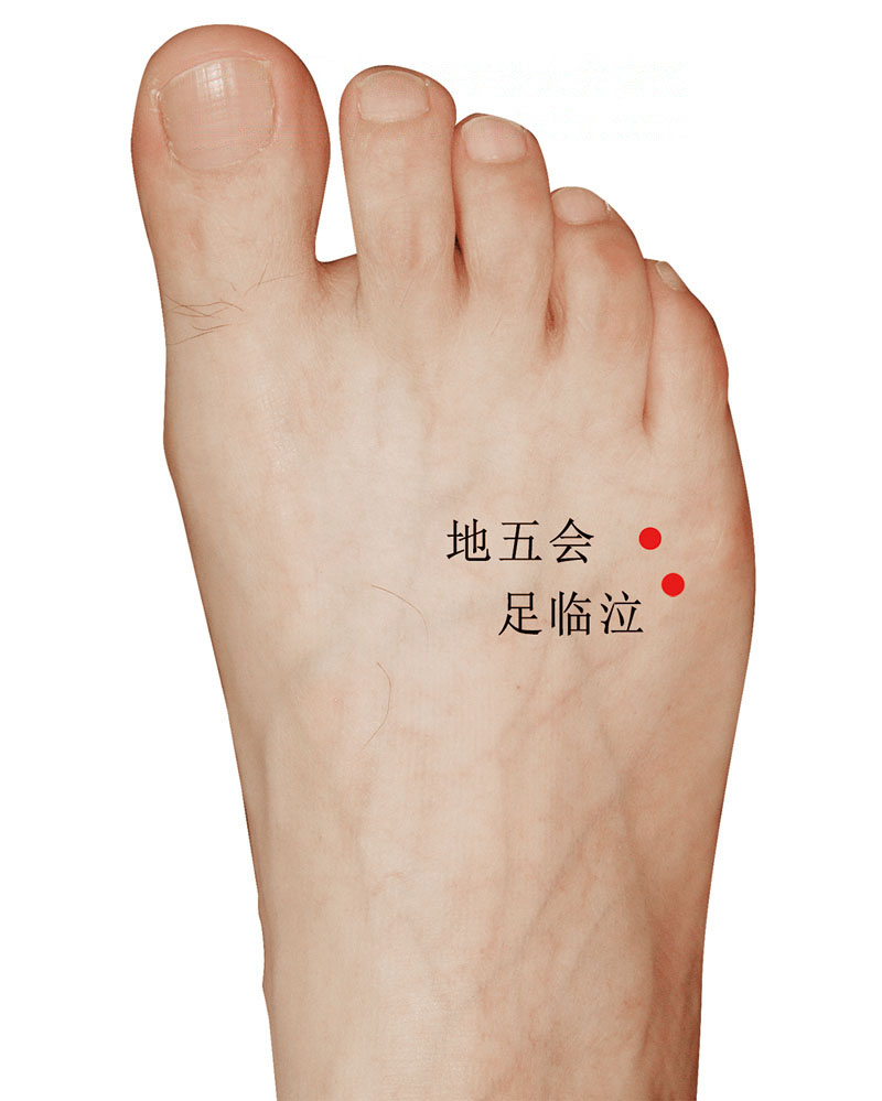 坐位或仰卧位,小趾向上翘起。在第4、5跖骨之间可见一凸起肌腱(即小趾伸肌腱),在该肌腱的内侧缘凹陷处,即为本穴。 -