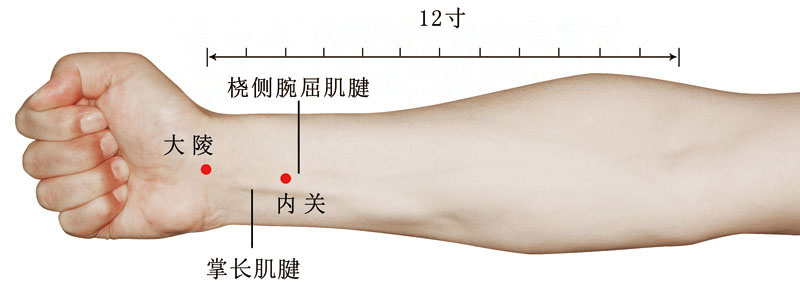 第3步:在近掌侧腕横纹中点,两筋之间的凹陷处,即为本穴。 -