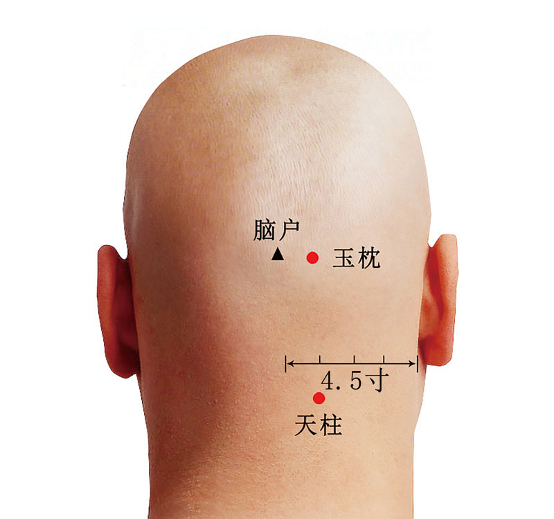 在项部,大筋(斜方肌)外缘之后发际凹陷中,约当后发际线正中旁开1.3寸。 -