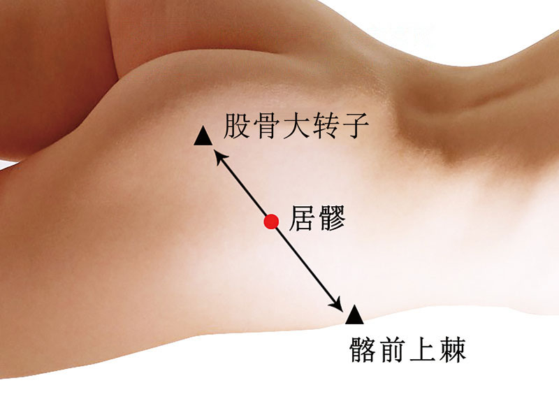 侧卧位。拇指按于髂后上棘,中指按于股骨大转子(在髋骨的中下方,可摸到一圆而大的骨突起,手按于上面,下肢屈伸时明显触摸其活动),示指自然张开置于两指之间,示指所致凹陷处,即为本穴。 -