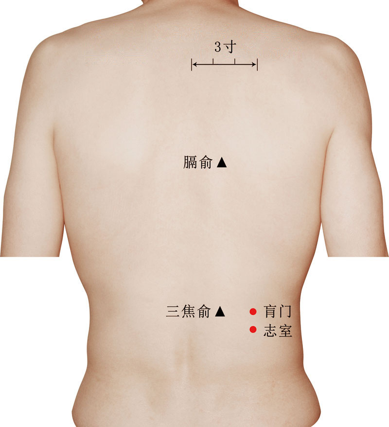 第4步:在第2腰椎棘突下有一凹陷,此凹陷旁开4横指(食指、中指、无名指、小指四指并拢,以中指近端指间关节横纹水平的四指宽度为3寸,也称一夫法)处,即为本穴。 -