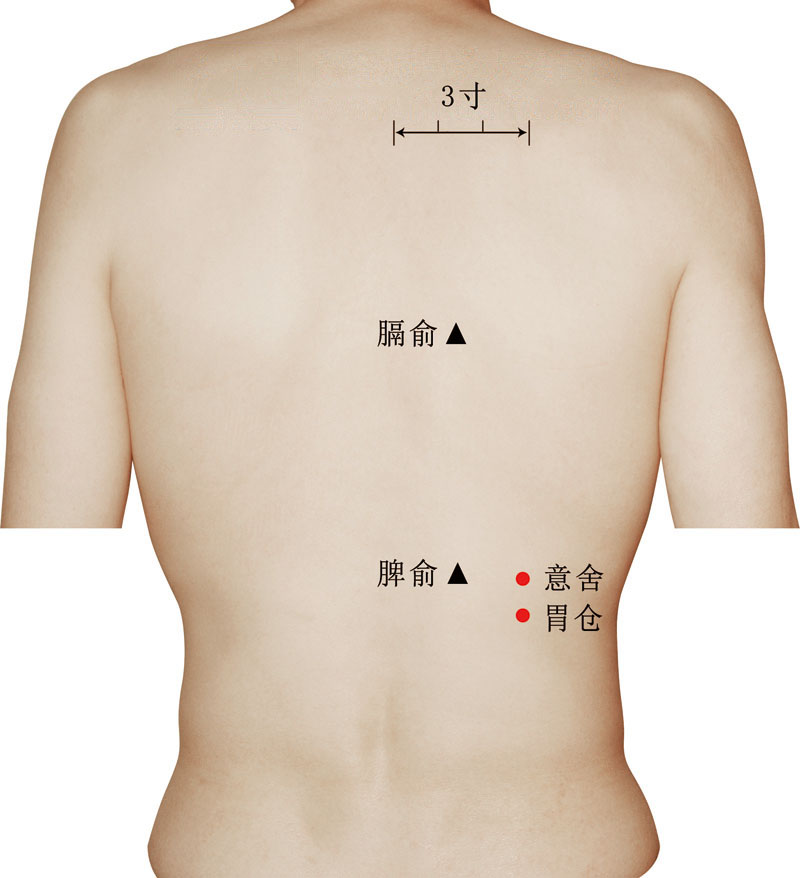 正坐或仰卧位。取一线过肚脐绕腹腰一周,与肚脐中相对应处即第2腰椎,由此往上推3个椎体(即第11胸椎),再从其棘突下缘旁开量4横指,按压有酸胀感处,即为本穴。 -