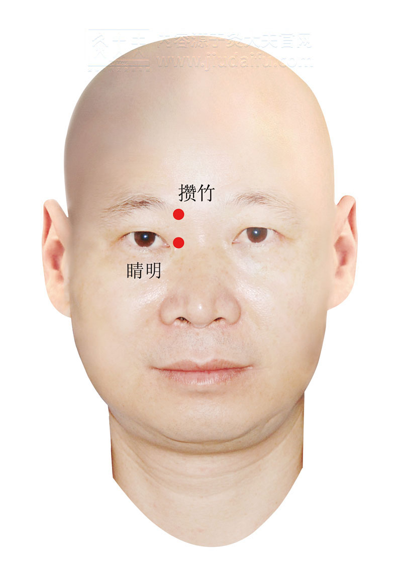 第2步:皱眉,可见眉毛内侧端有一隆起,即为本穴。 -