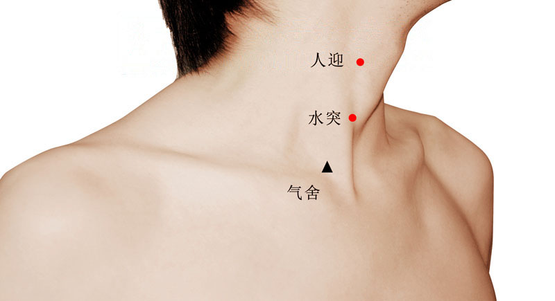 正坐或仰卧位。先确定人迎与气舍的位置,取一表明二等分的弹性皮筋,拉长皮筋,使其两端分别对应人迎和气舍,皮筋中点对应处(处于胸锁乳突肌的前缘),按压有痛感,即为本穴。 -