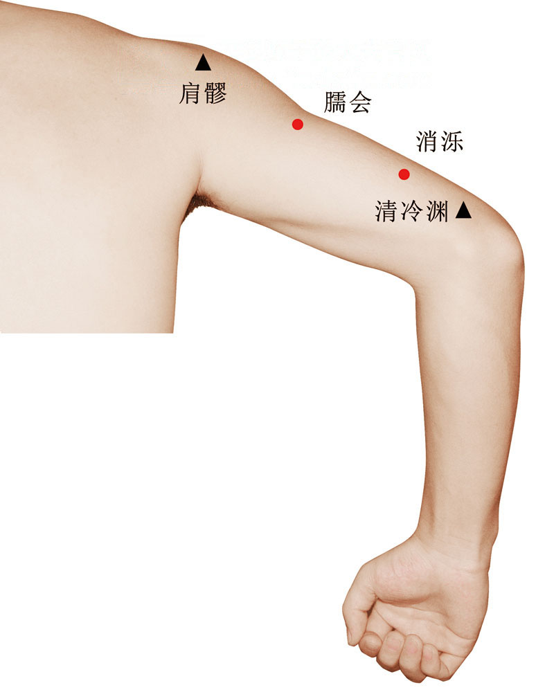 坐位屈肘。在臂外侧,当清泠渊与臑会连线的中点处。 -