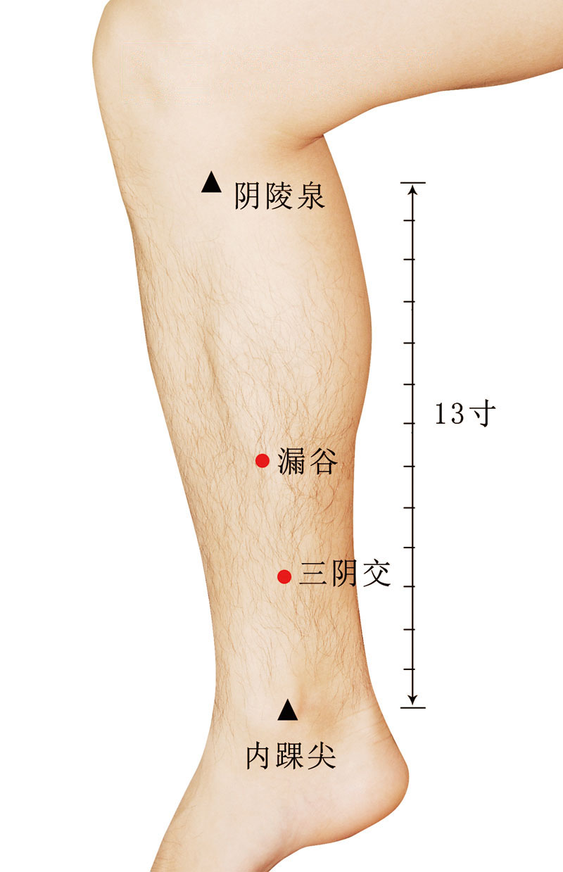 第2步:从内踝最高点沿小腿内侧骨(胫骨)内缘直上量两个4横指(食指、中指、无名指、小指四指并拢,以中指近端指间关节横纹水平的四指宽度为3寸,也称一夫法),按压有酸痛感处,即为本穴。 -