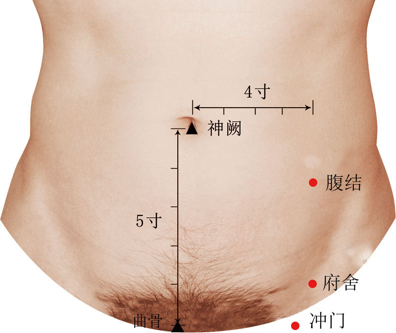 站立位或仰卧位。从大横(参见“大横”)沿垂直线向下量1.3寸(拇指1横指为1寸)。 -