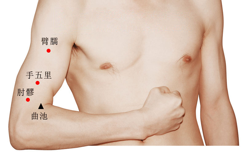 在曲池与肩髃连线上,曲池上7寸。自然垂臂时在臂外侧,三角肌止点处。 -