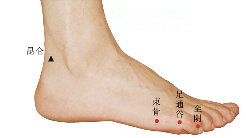 在足小趾外侧,由足小趾趾甲外侧缘(即掌背交界线,又称赤白肉际)与下缘各作一垂线之交点处,即为本穴。 -