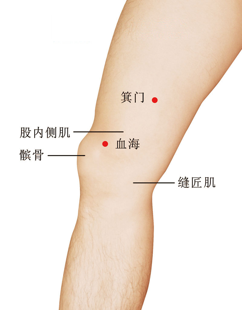 屈膝,在大腿内侧,髌底内侧端上2寸,当股四头肌内侧头的隆起处。 -