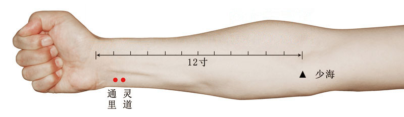 伸肘仰掌,用力握拳。在手前臂内侧可触摸到一条大筋(尺侧腕屈肌腱),从腕横纹沿此肌腱的外侧向上量1横指,按压有酸胀感,即为本穴。 -
