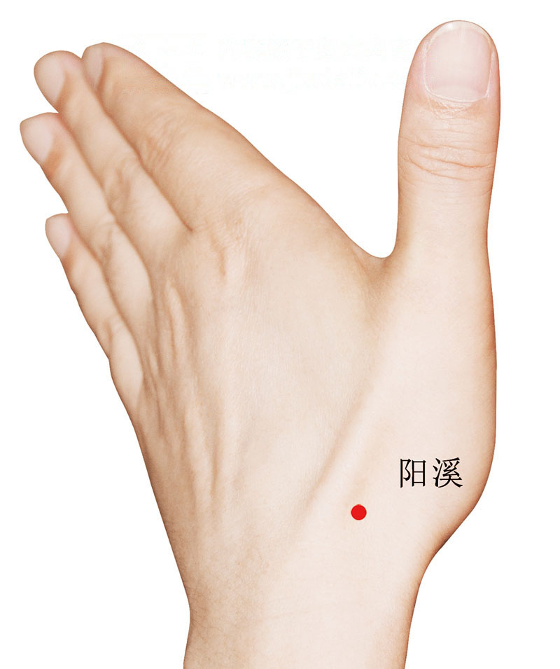 在腕背横纹桡侧,手拇指上翘时,当拇长伸肌腱与拇短伸肌腱之间的凹陷中。 -