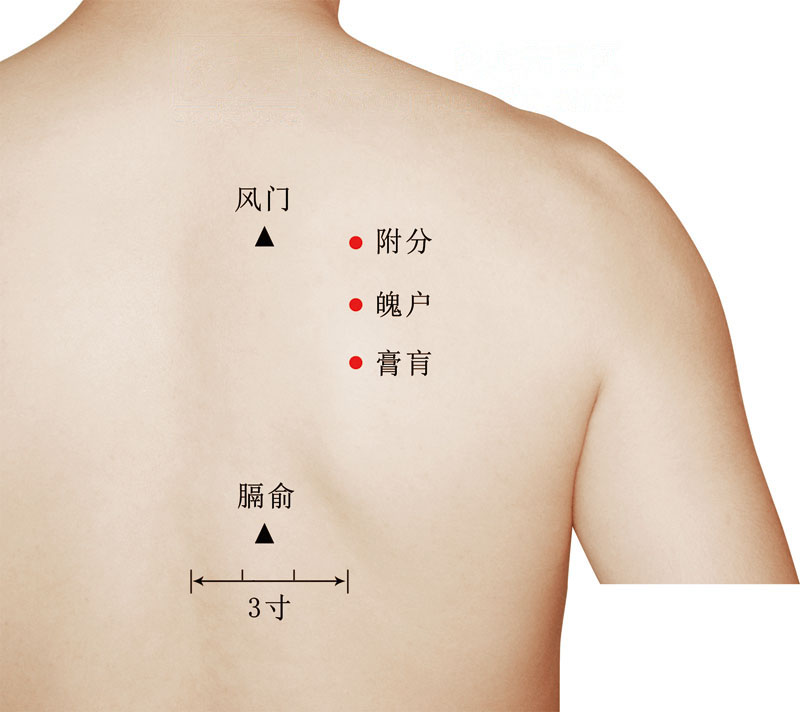 第6步:在第2胸椎棘突下作一水平线,该线与肩胛内缘的交点处,即为本穴。 -