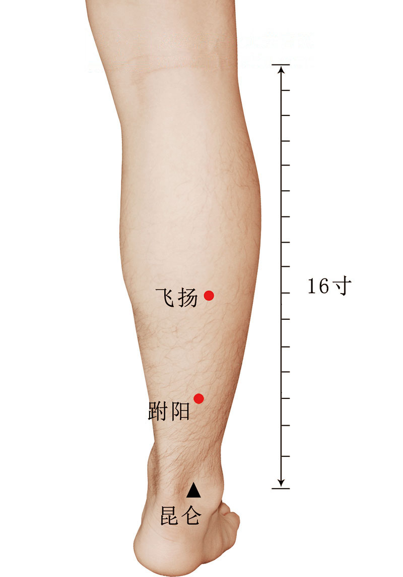 在小腿后面,当外踝后,昆仑穴直上7寸,承山外下方1寸处。 -