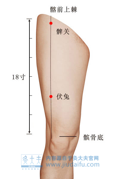 在大腿前面,当髂前上棘与髌底外侧端的连线上,屈股时,平会阴,居缝匠肌外侧凹陷处。 -