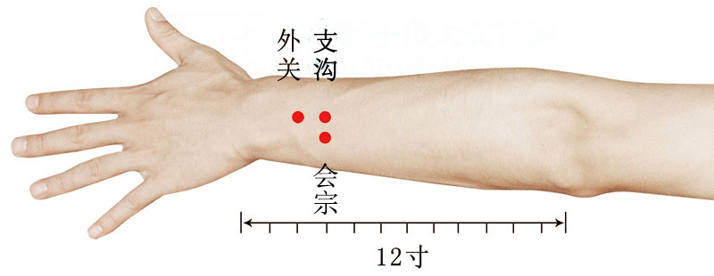 在前臂背侧,当腕背横纹上3寸,支沟尺侧,尺骨的桡侧缘。 -