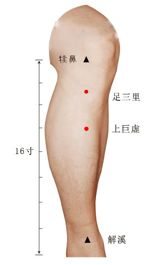在小腿前外侧,当犊鼻下6寸,距胫骨前缘1横指(中指)。 -
