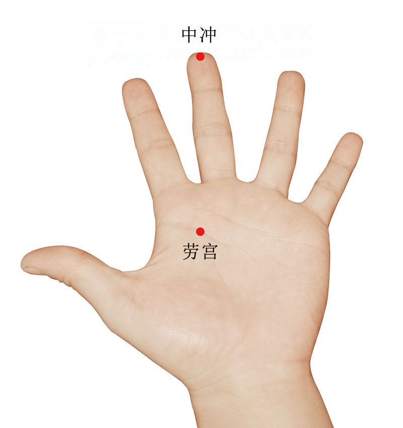 第2步:中指尖所指掌心处,在第二掌横纹稍下方,偏于第3掌骨侧处,按压有酸胀感,即为本穴。 -