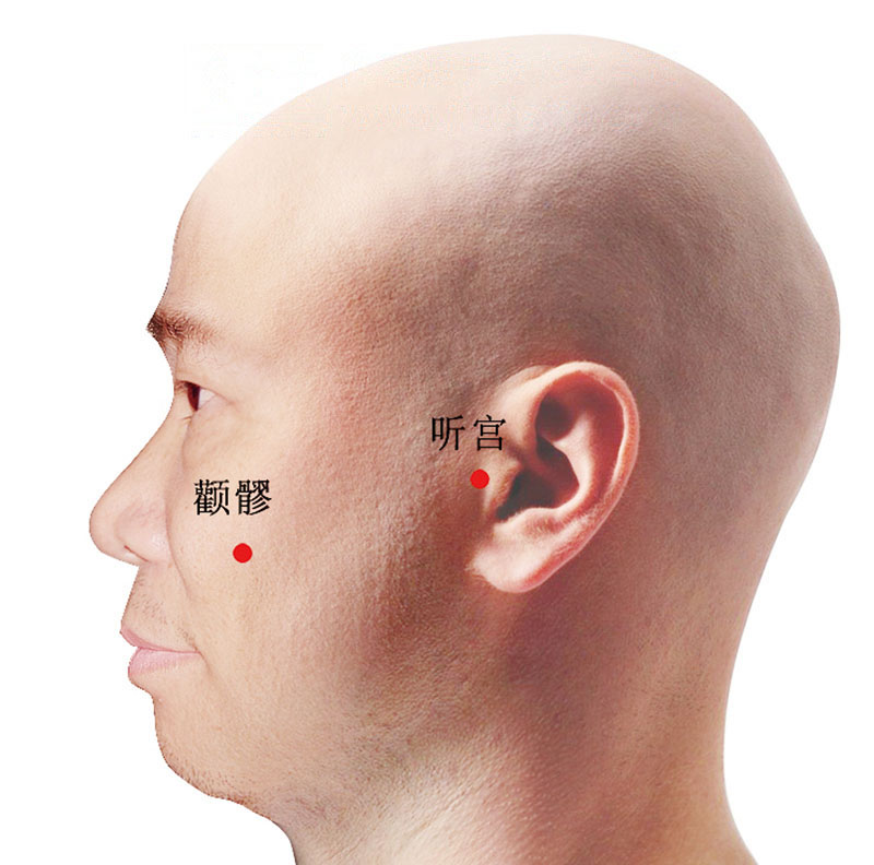 第2步:在耳屏前与下颌关节之间可触及一凹陷,闭口是凹陷即闭处,即为本穴。 -